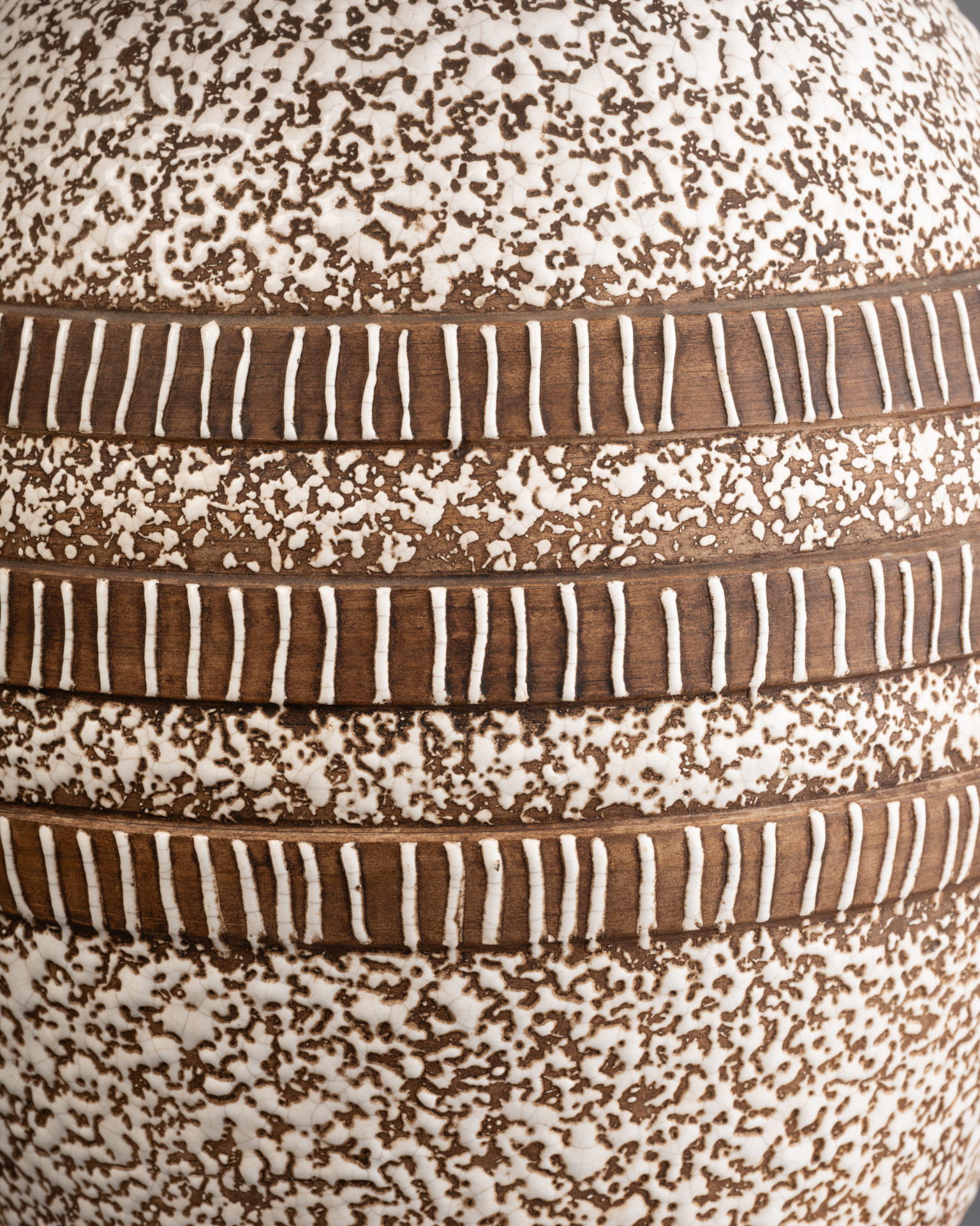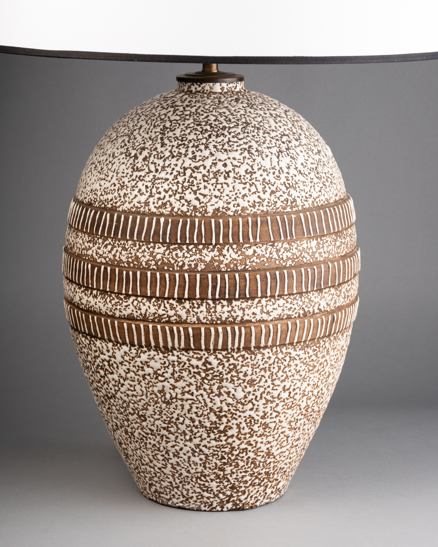Pied de lampe en céramique émaillée à surface crispée blanche et brune à décor de trois cercles bruns. Travail Français des années 1960