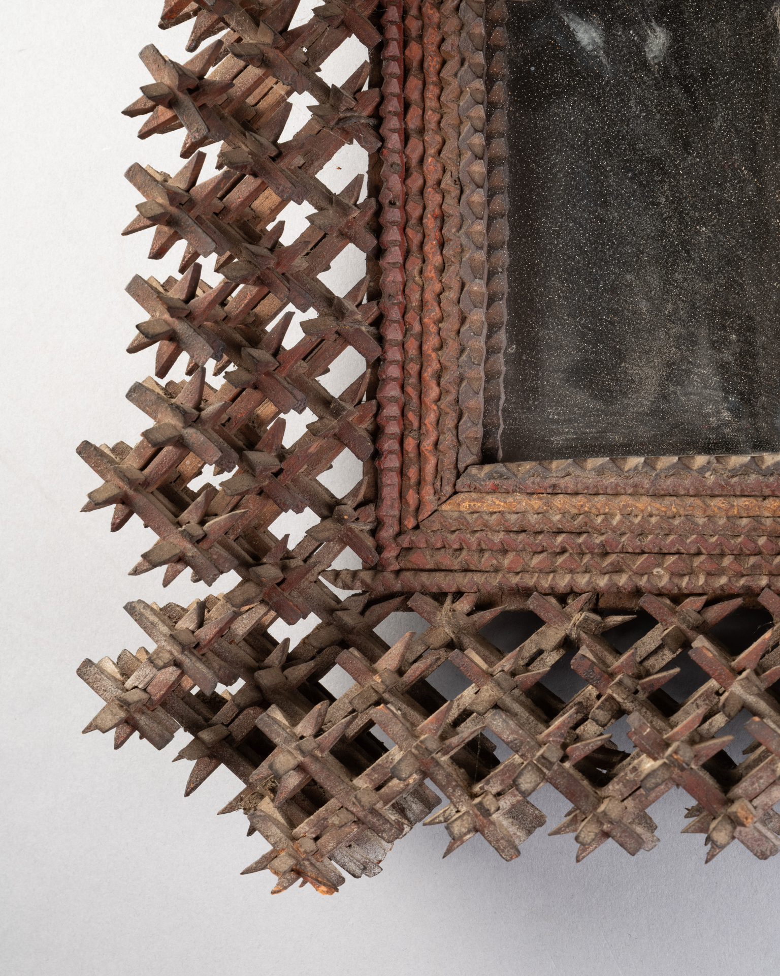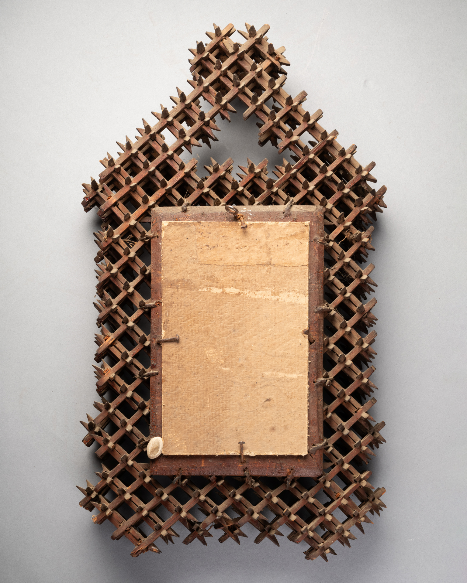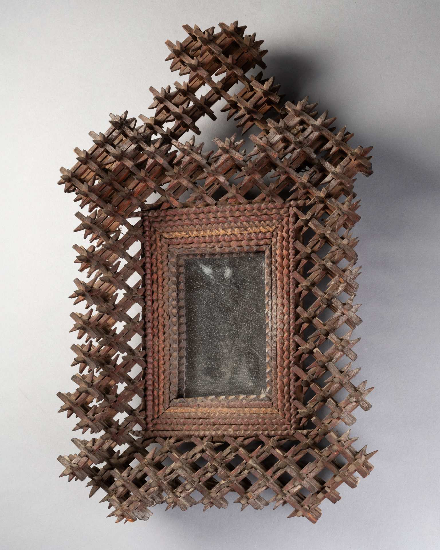 Petit miroir dans un encadrement à fronton, fait d’un assemblage de nombreuses croix.