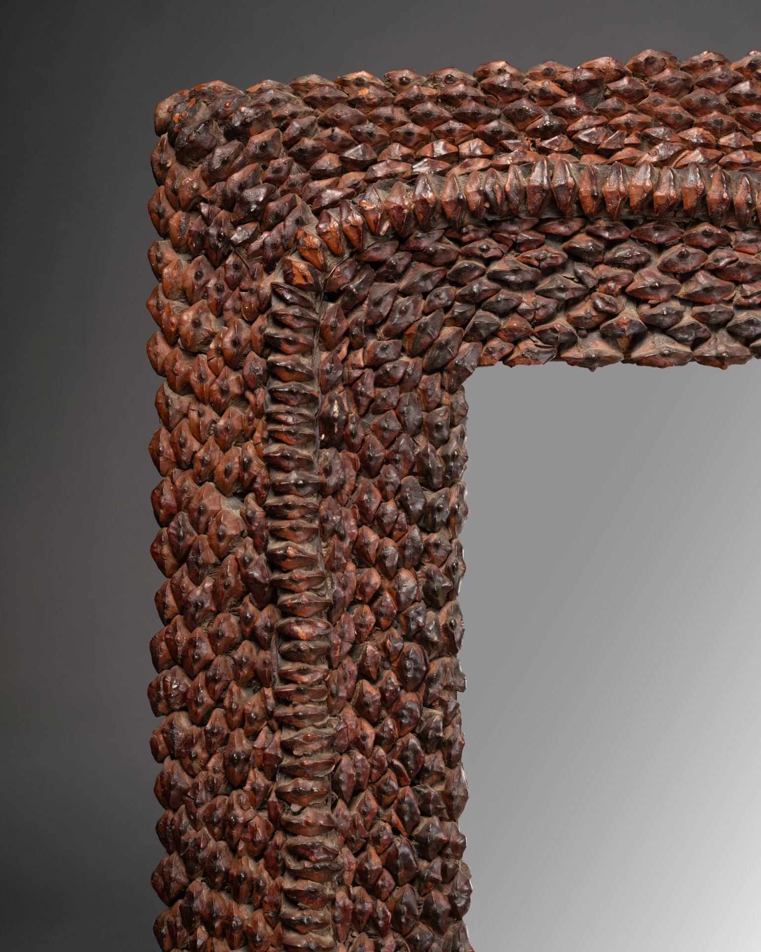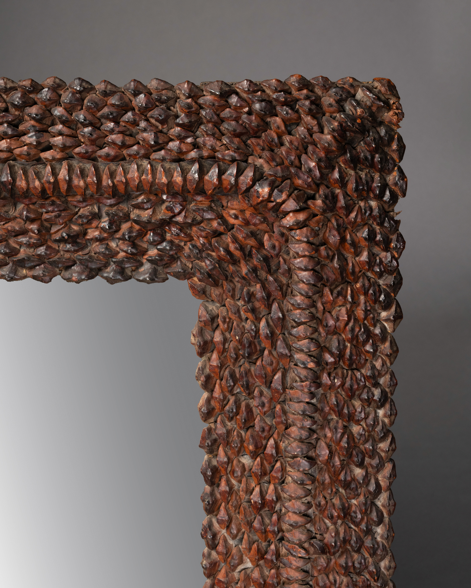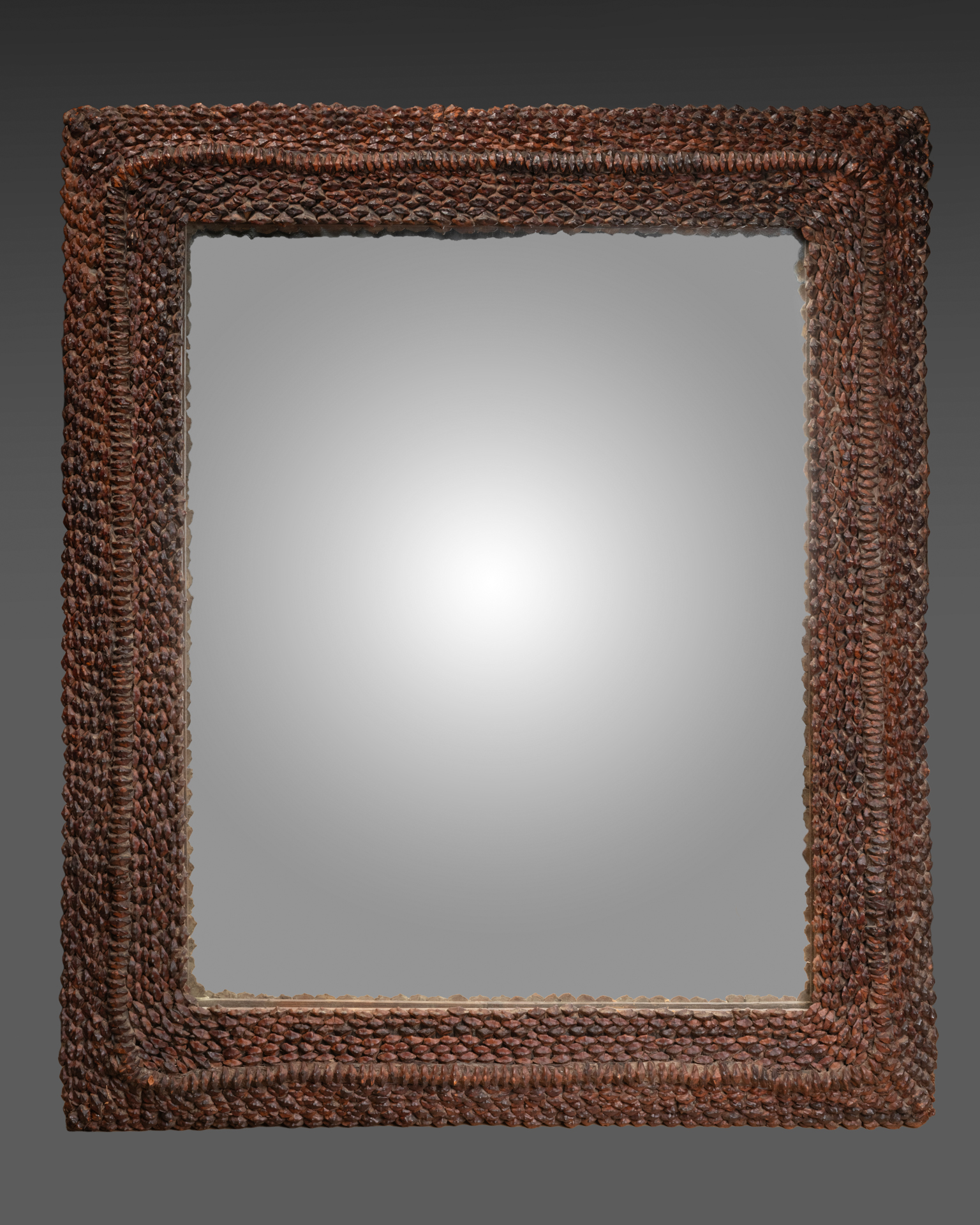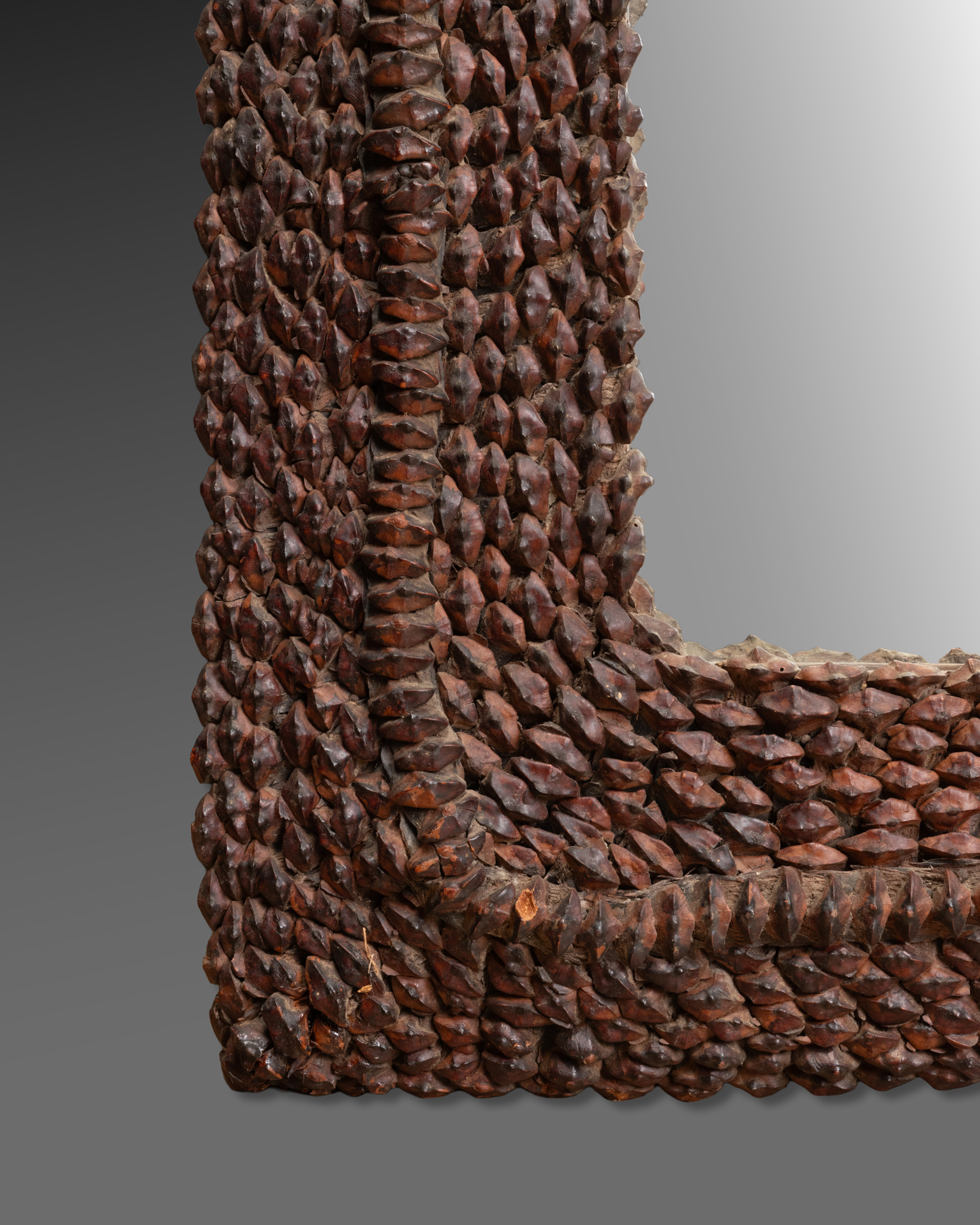 Miroir rectangulaire,l’entourage à décor appliqué d’éléments de pommes de pins alignés et superposés.