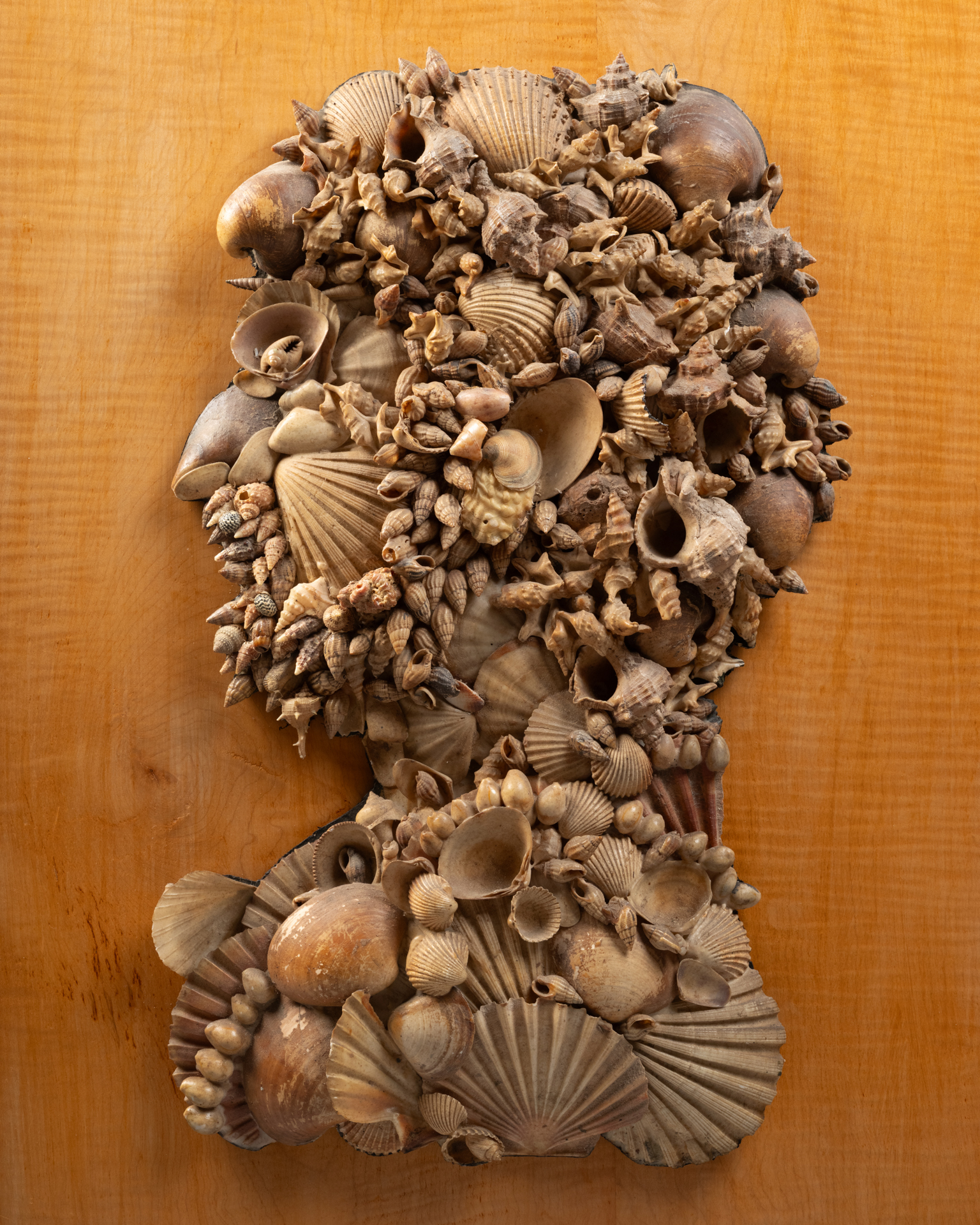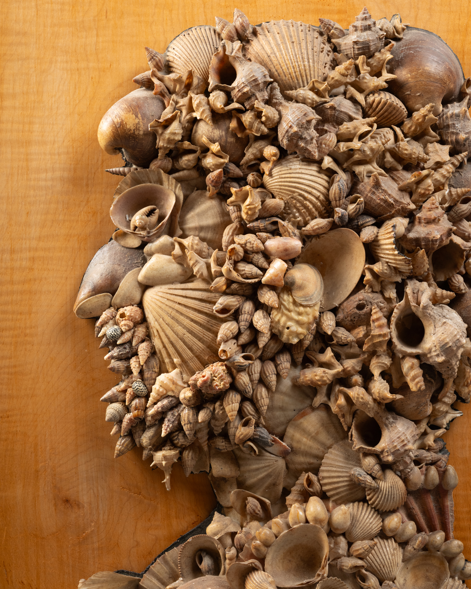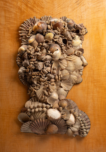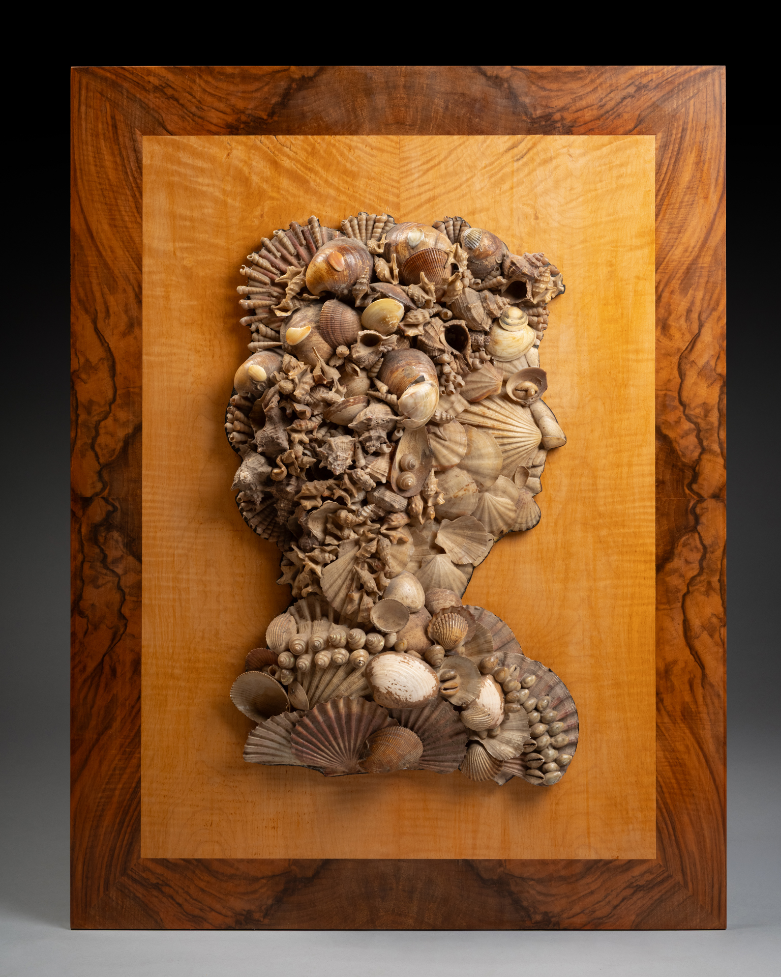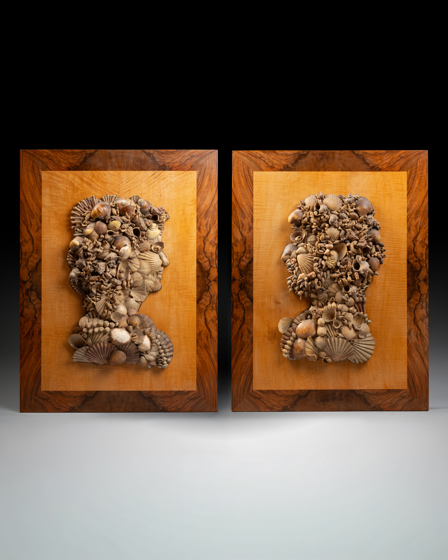 à la manière d’Arcimboldo,profils en coquillage d’un homme et d’une femme remontés sur un fonds en bois de placage dans le goût de Renzo Mongiardino.