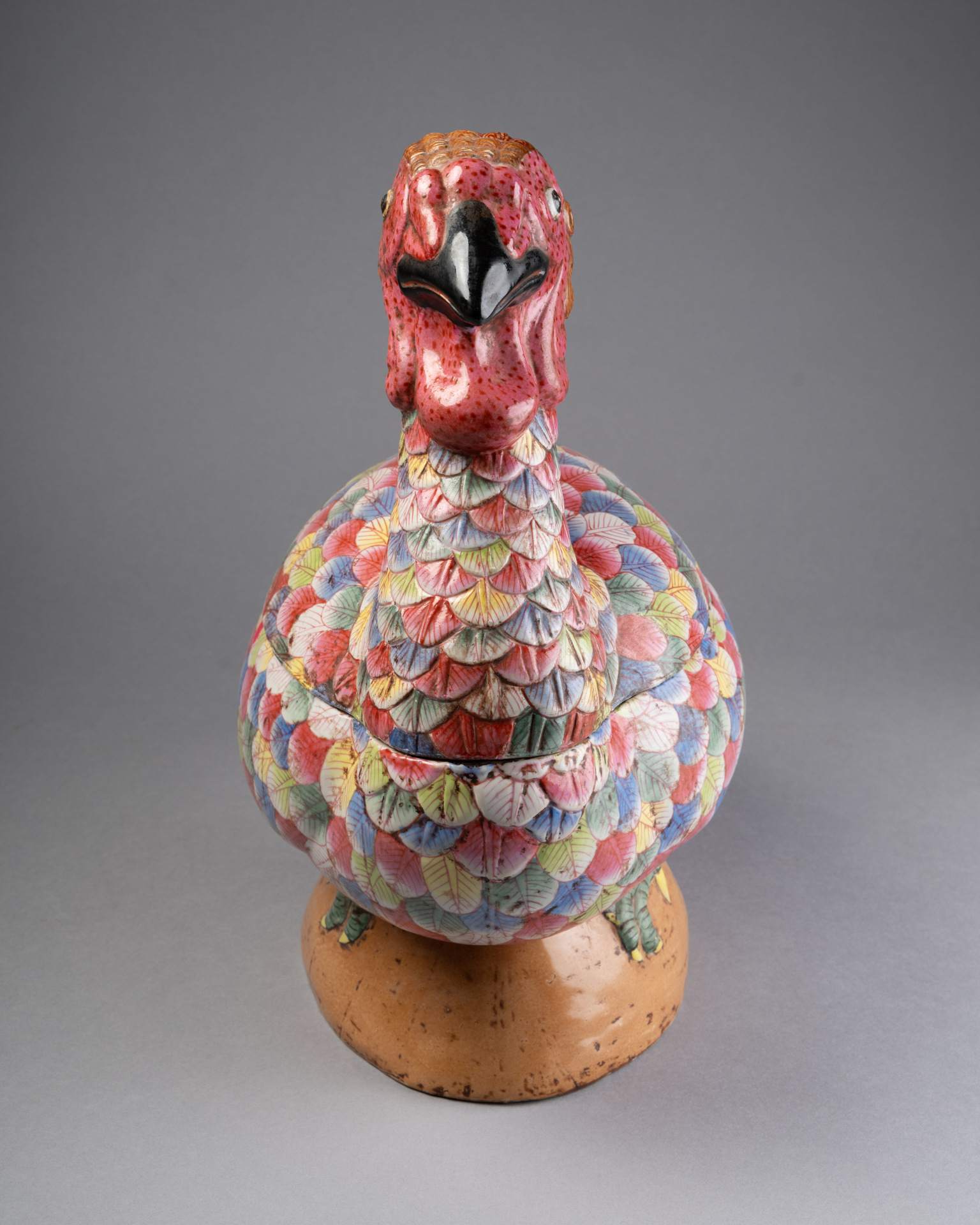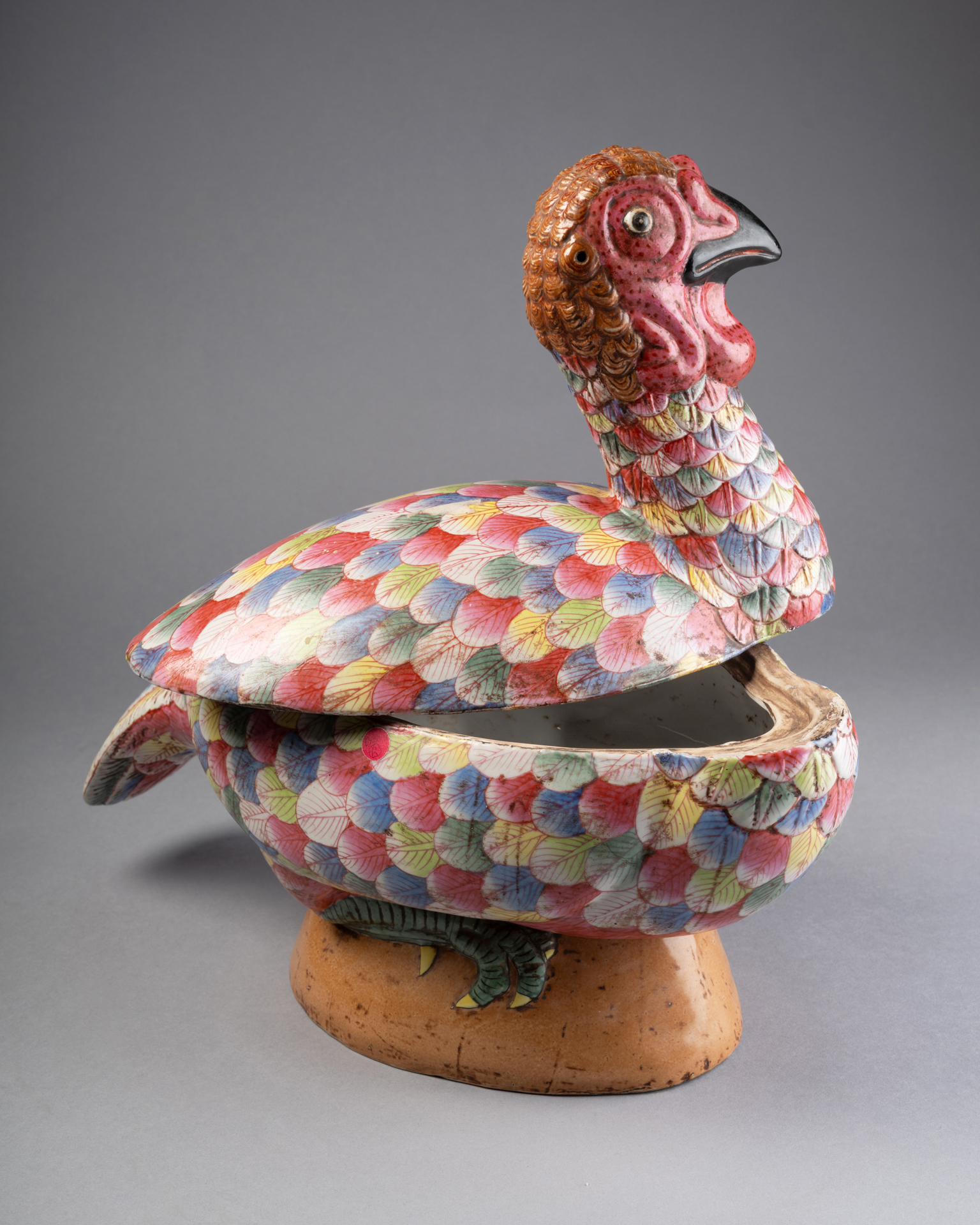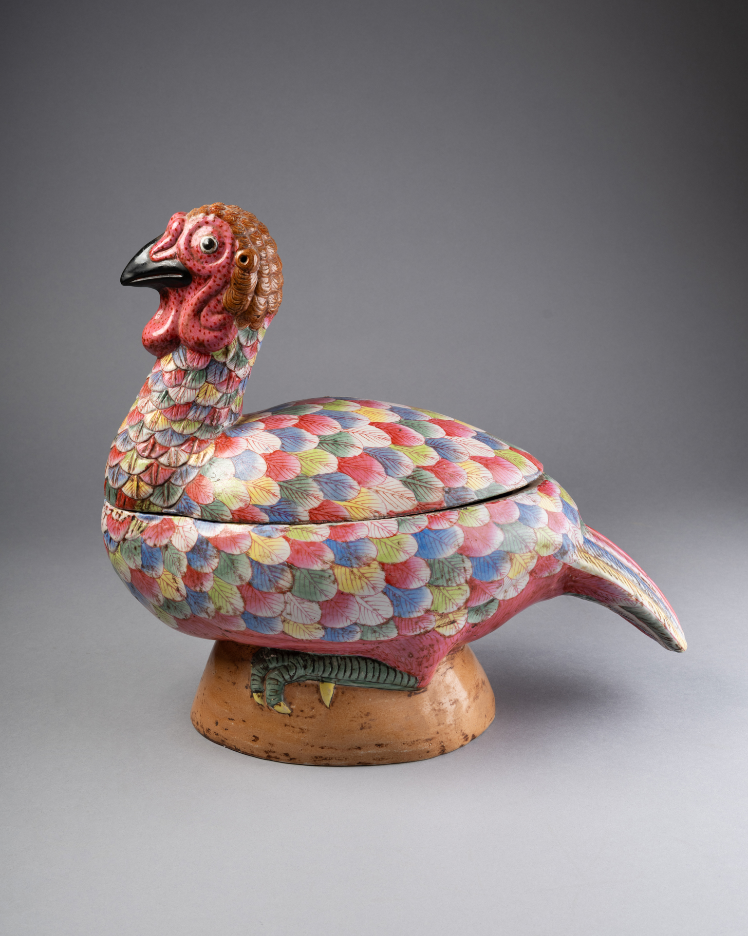 Terrine couverte en porcelaine polychrome en forme de dindon. Travail de décoration du XX ème siècle.