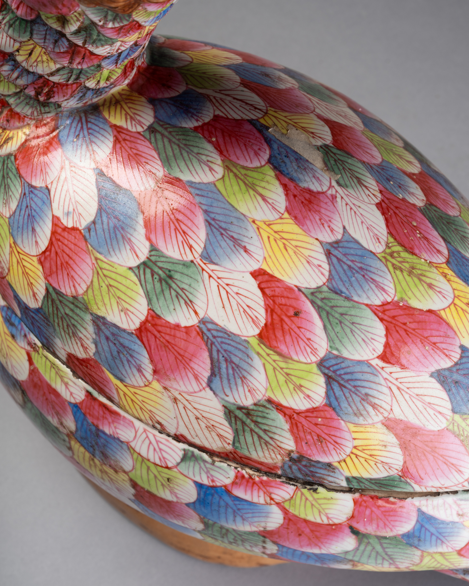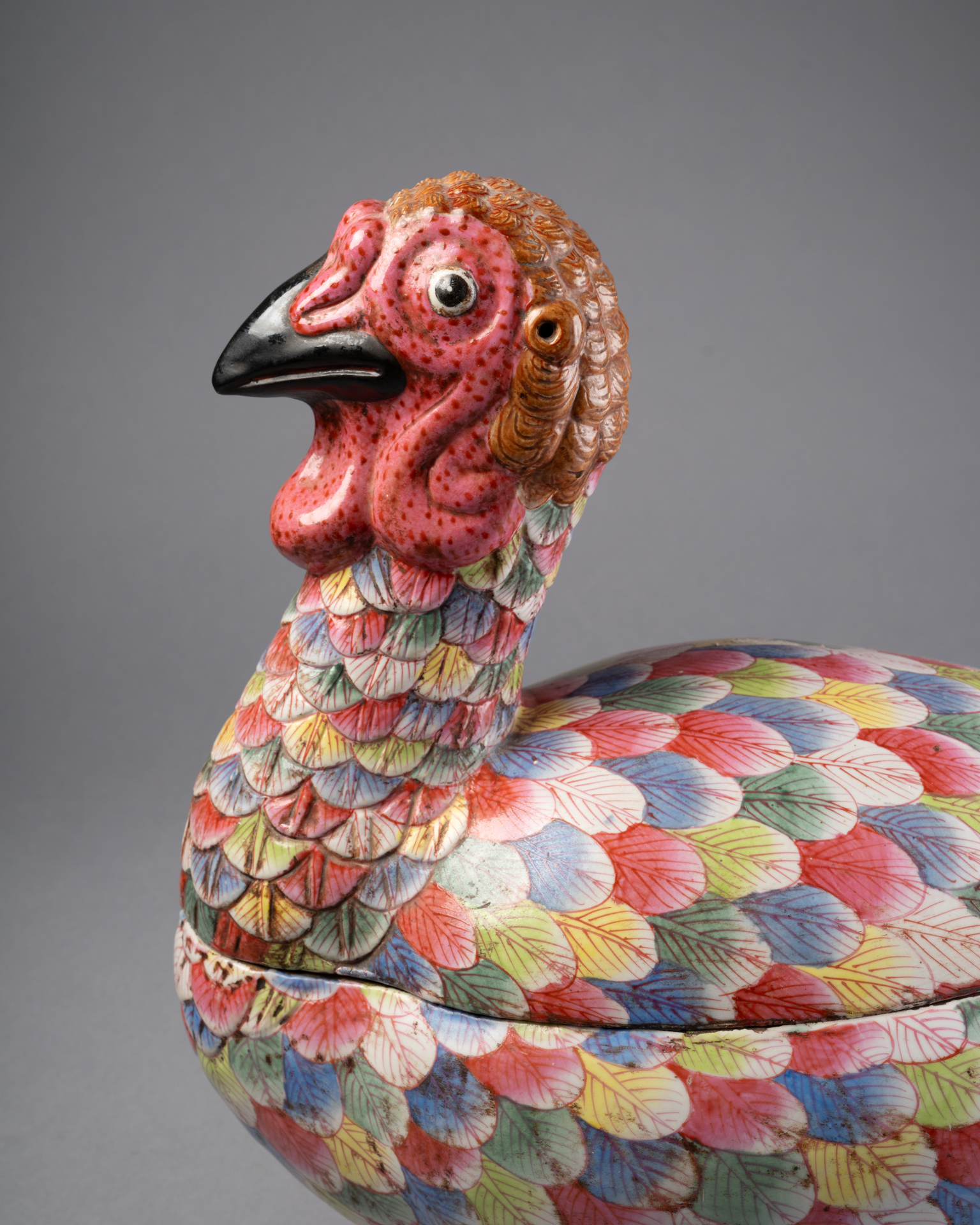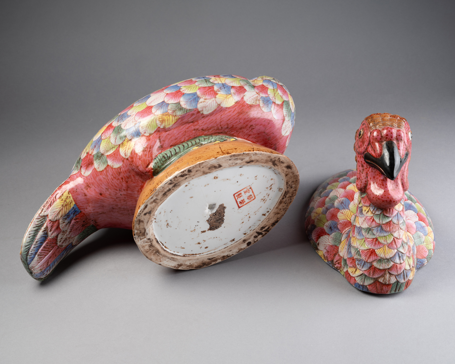 Terrine couverte en porcelaine polychrome en forme de dindon. Travail de décoration du XX ème siècle.