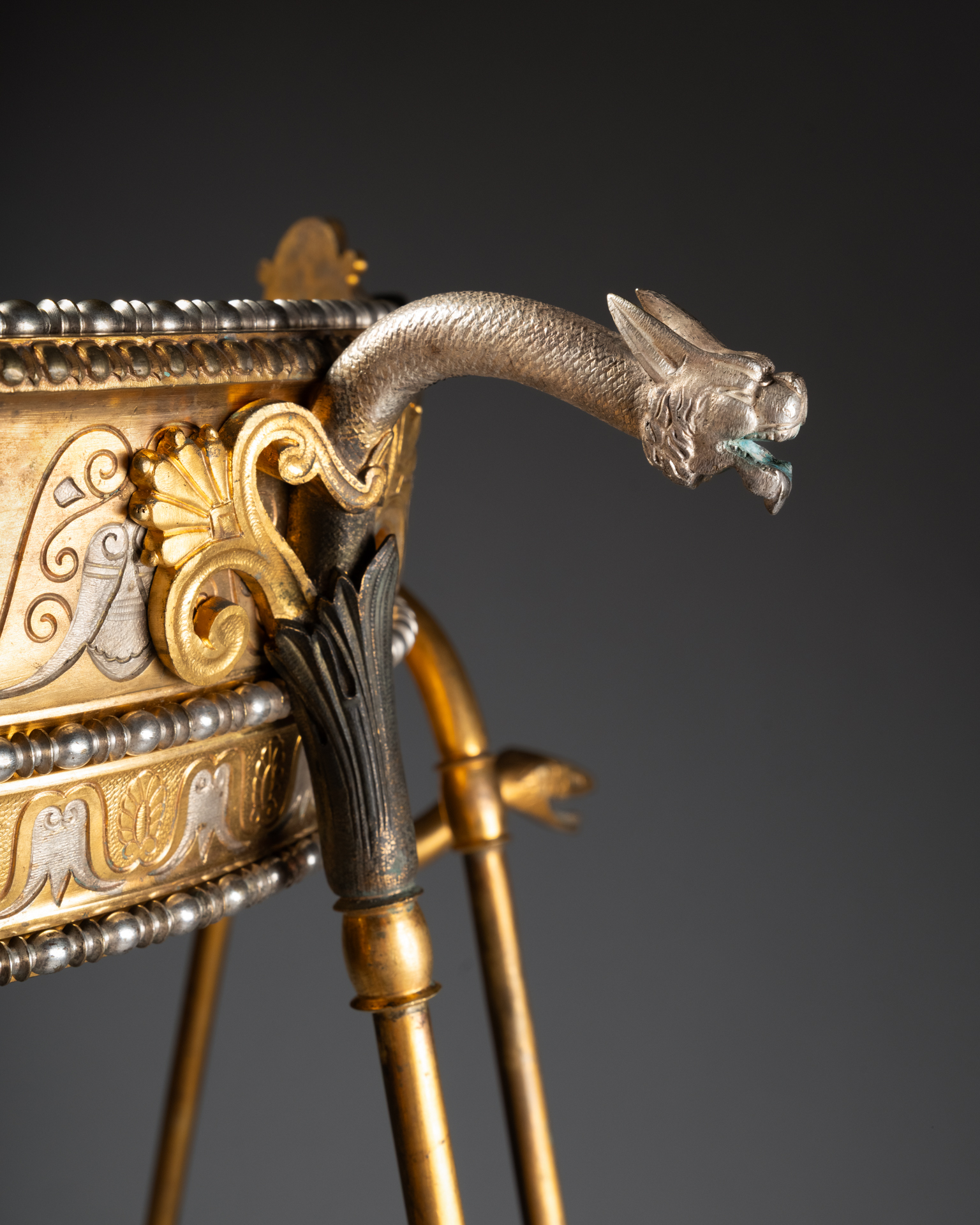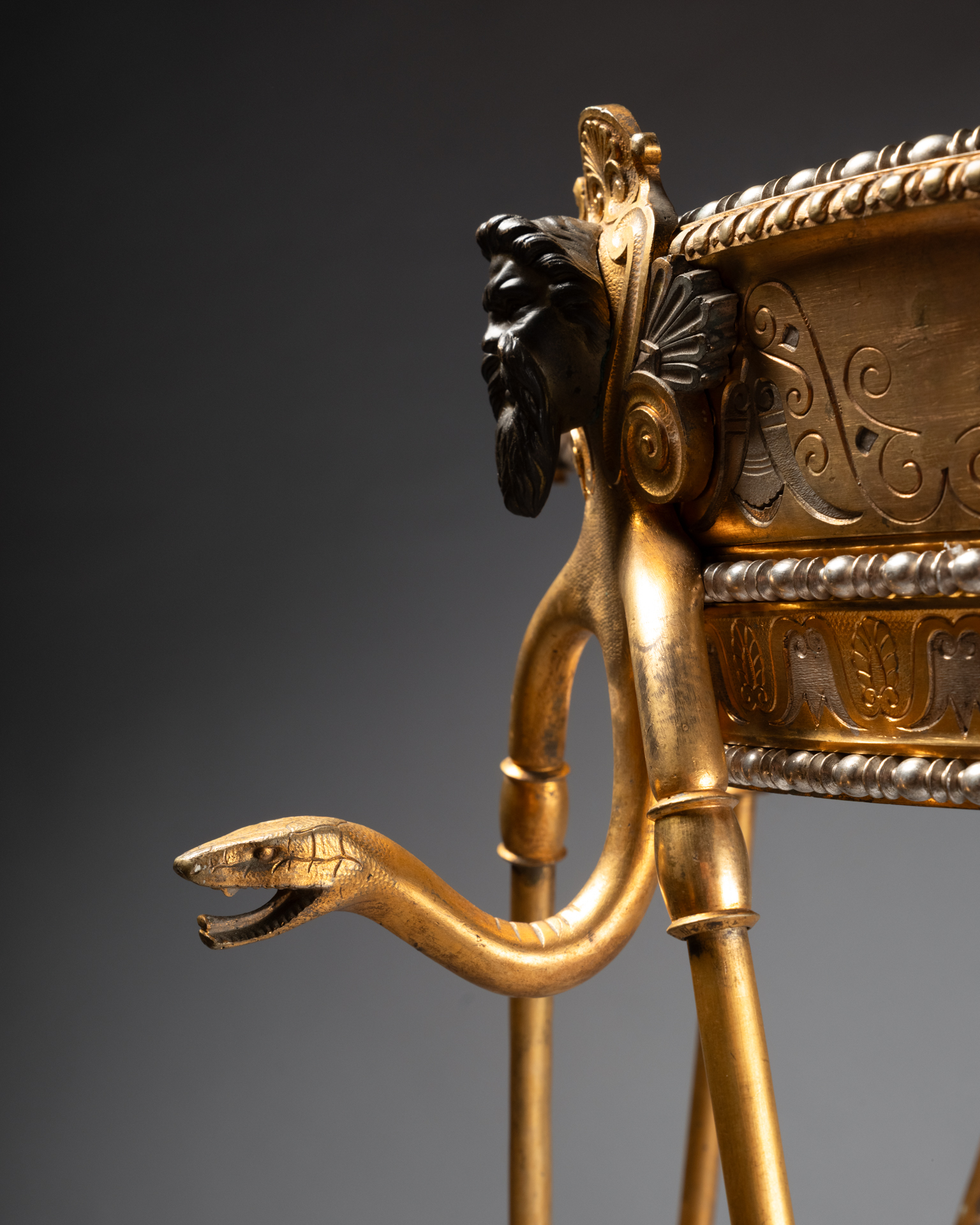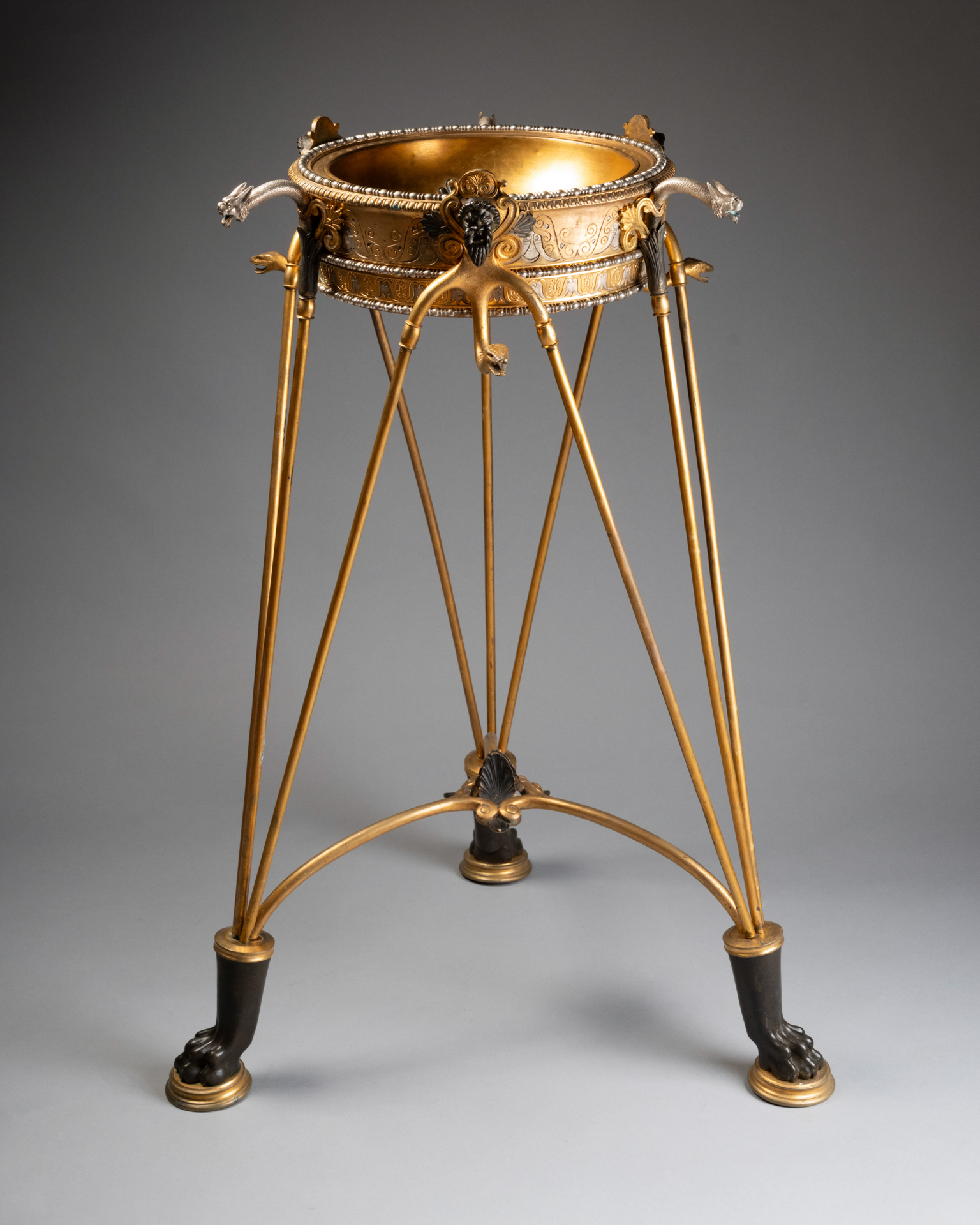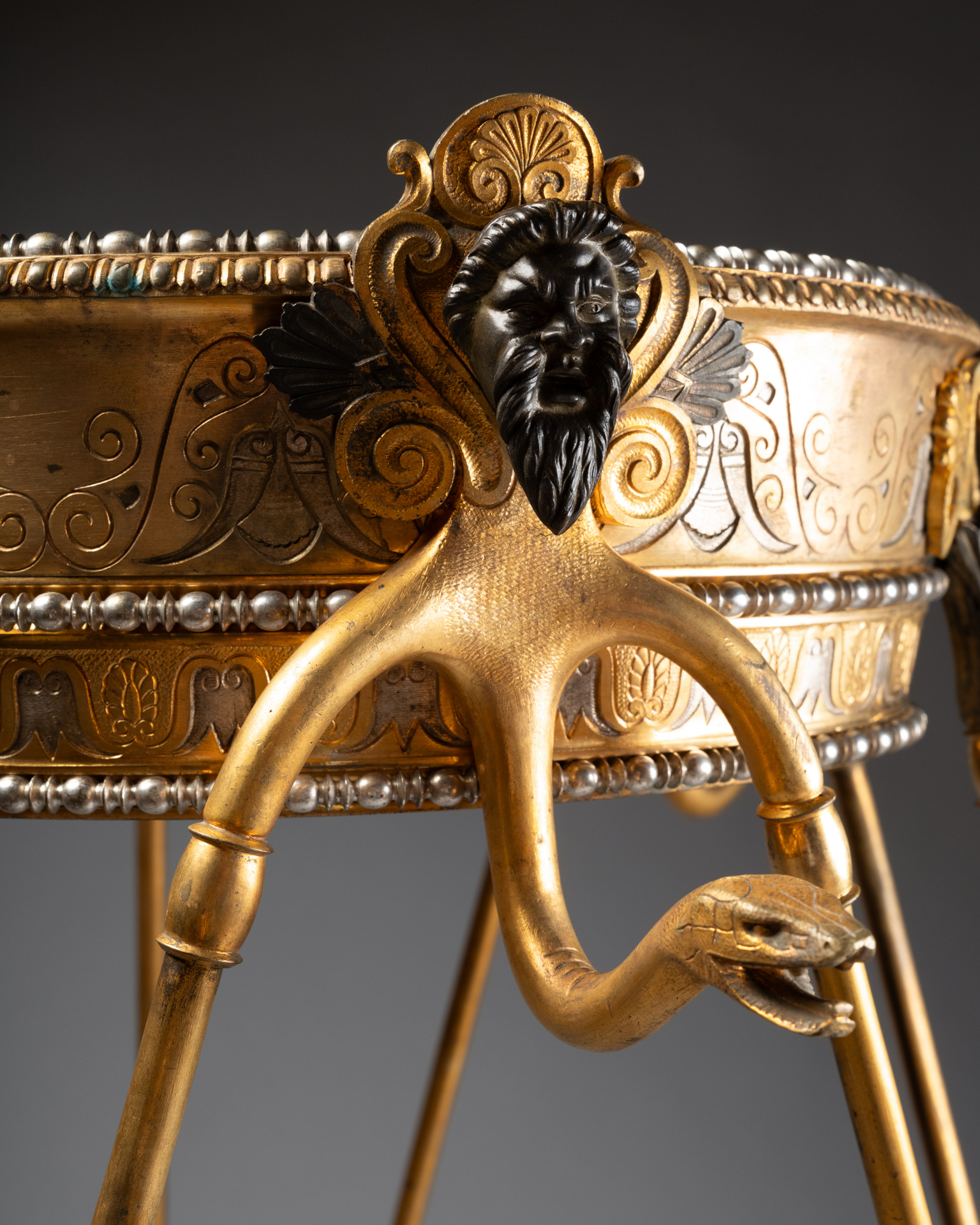Les trois supports prennent la forme de têtes masculines barbues traitées à l’antique, bustes anthropomorphes se prolongeant en bras stylisés, et animaux fantastiques assimilables à des griffons ou dragons, formant anses et éléments de liaison. Les pieds se terminent par des pattes griffues reposant sur des socles circulaires, renforçant l’aspect archaïsant et monumental de l’ensemble.