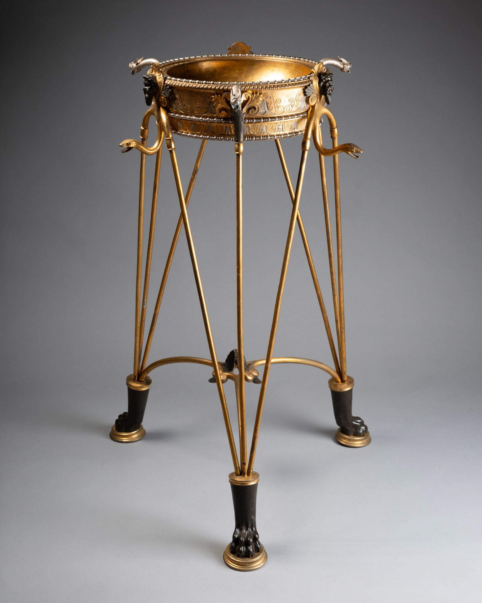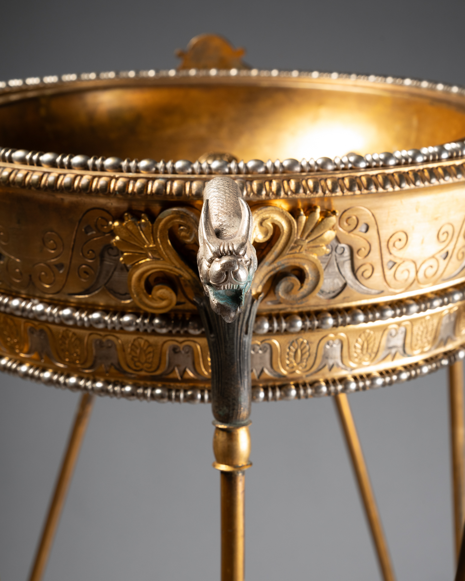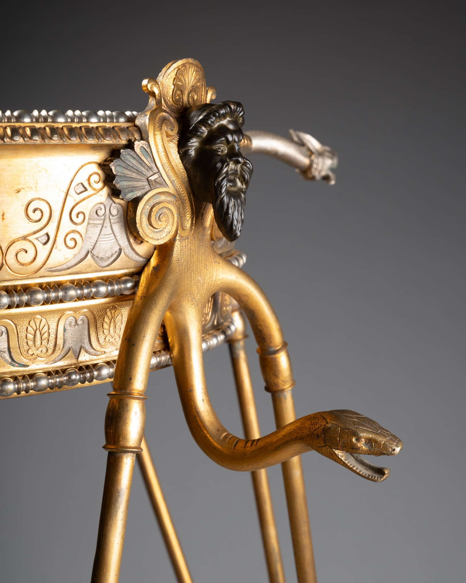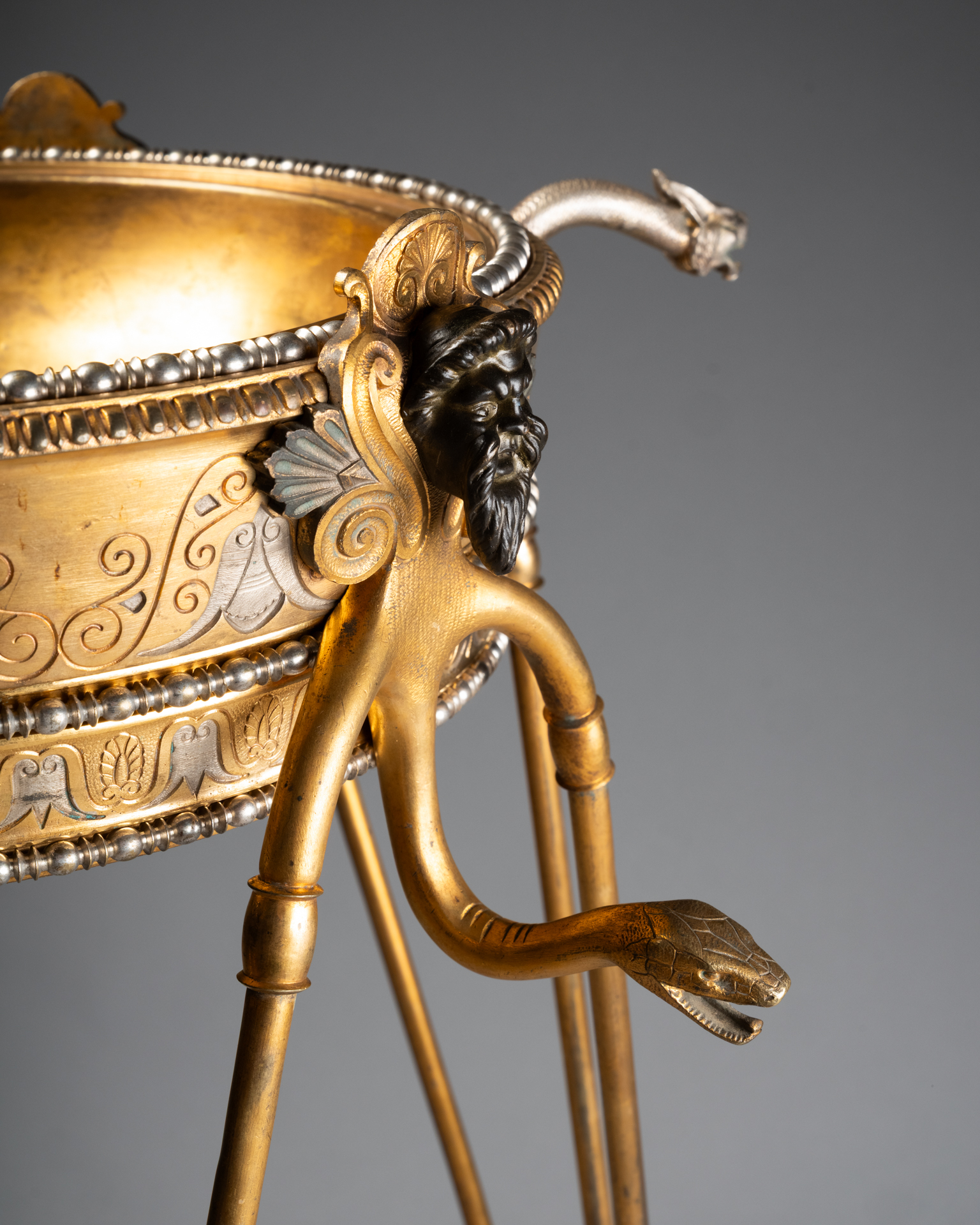 Les trois supports prennent la forme de têtes masculines barbues traitées à l’antique, bustes anthropomorphes se prolongeant en bras stylisés, et animaux fantastiques assimilables à des griffons ou dragons, formant anses et éléments de liaison. Les pieds se terminent par des pattes griffues reposant sur des socles circulaires, renforçant l’aspect archaïsant et monumental de l’ensemble.