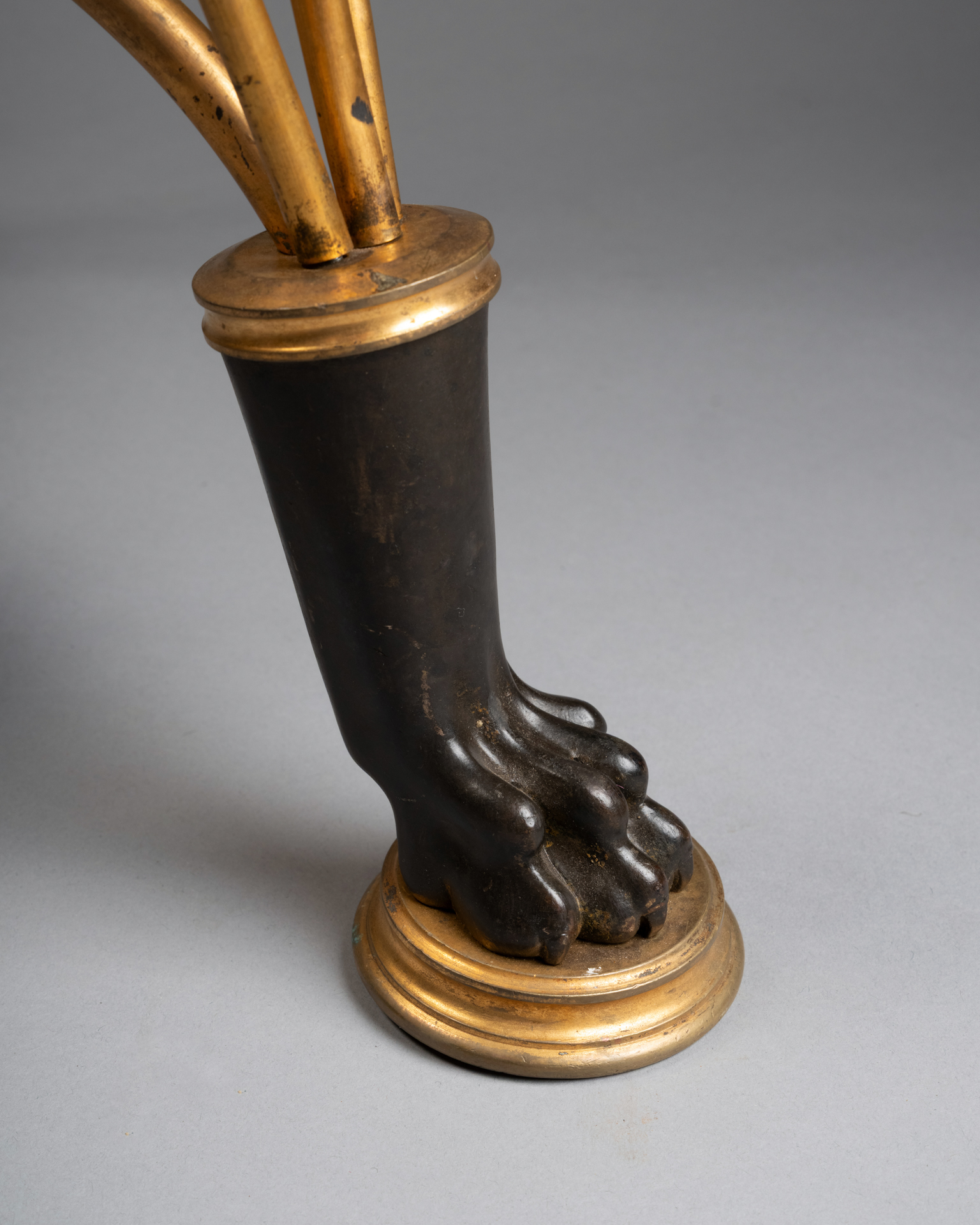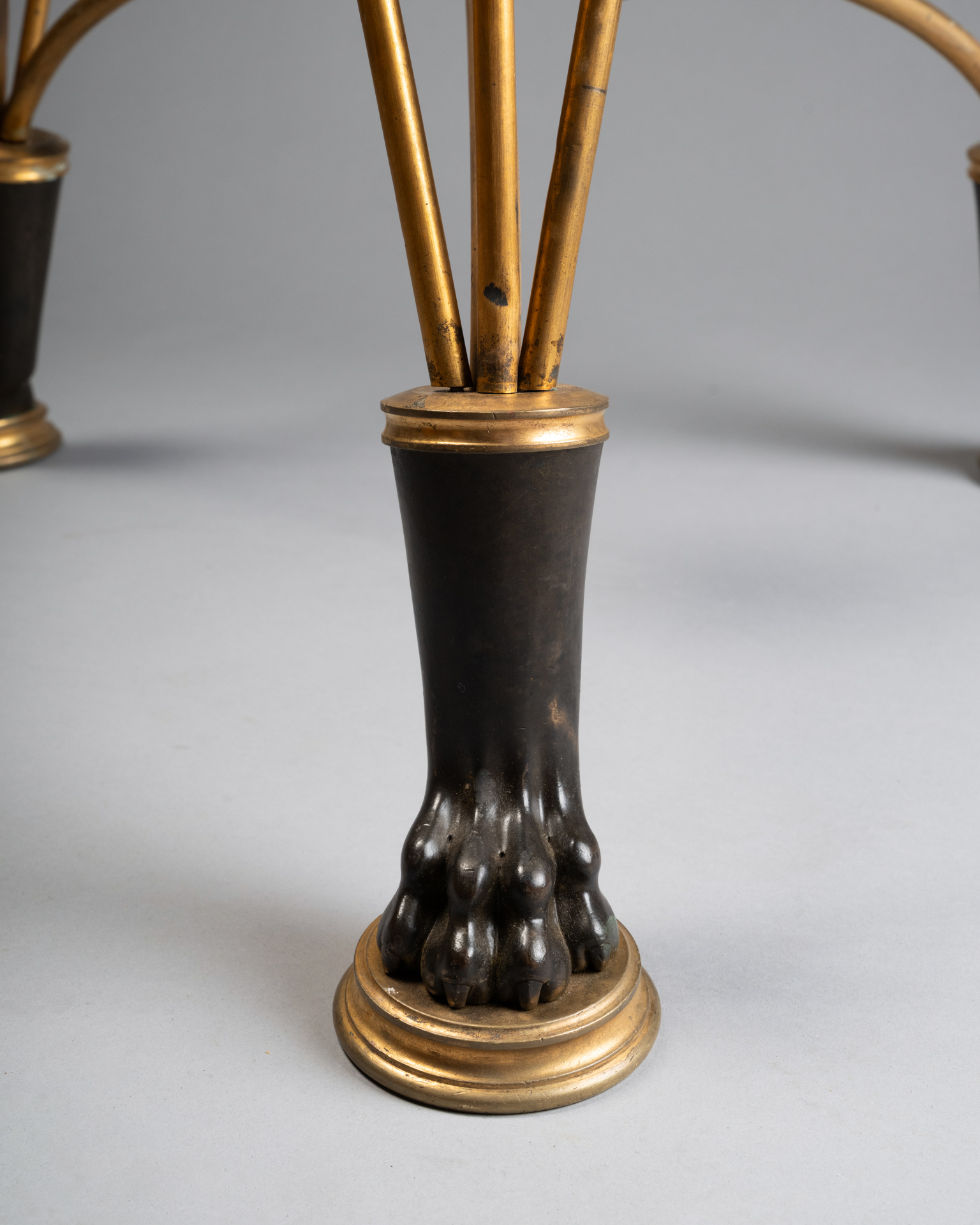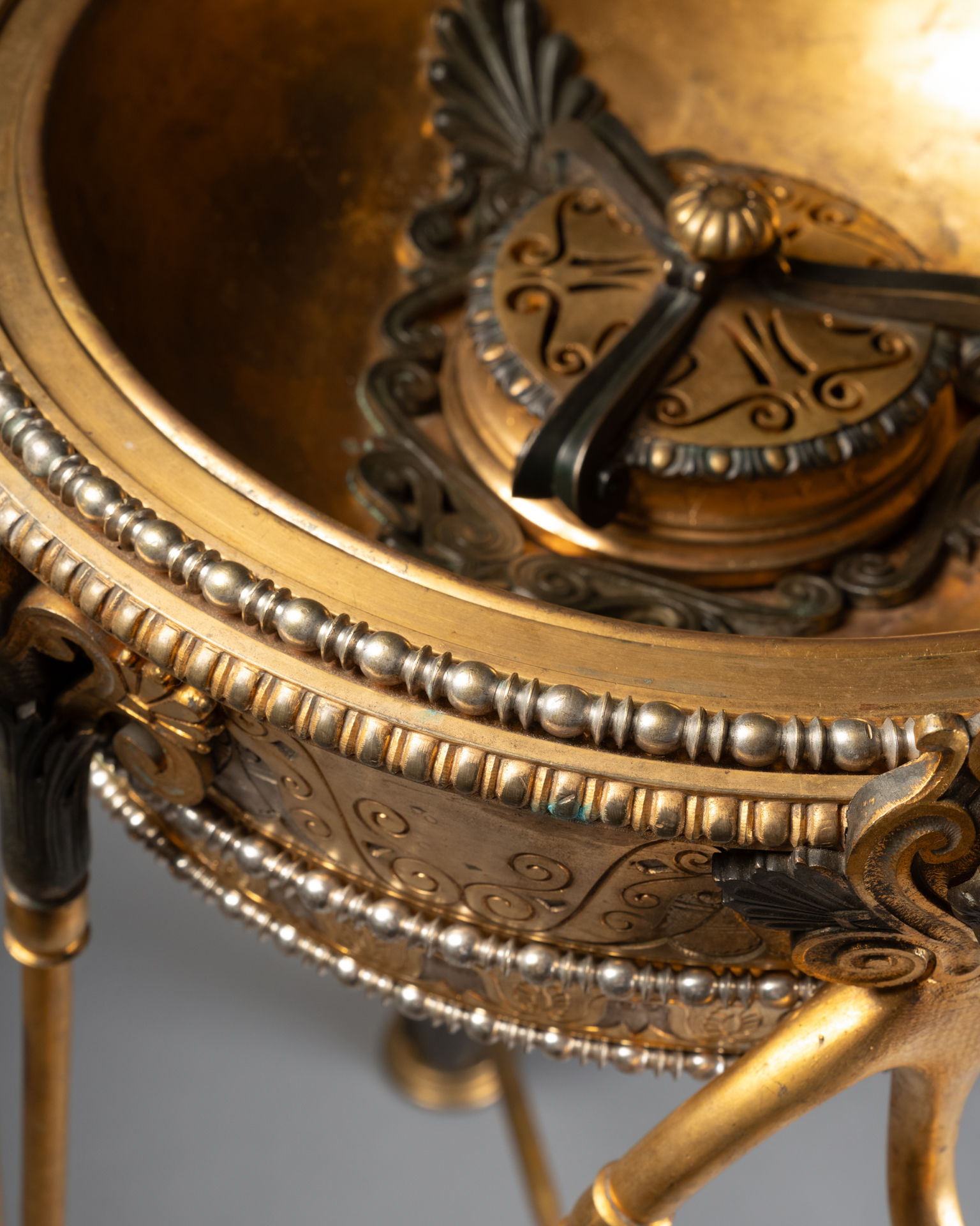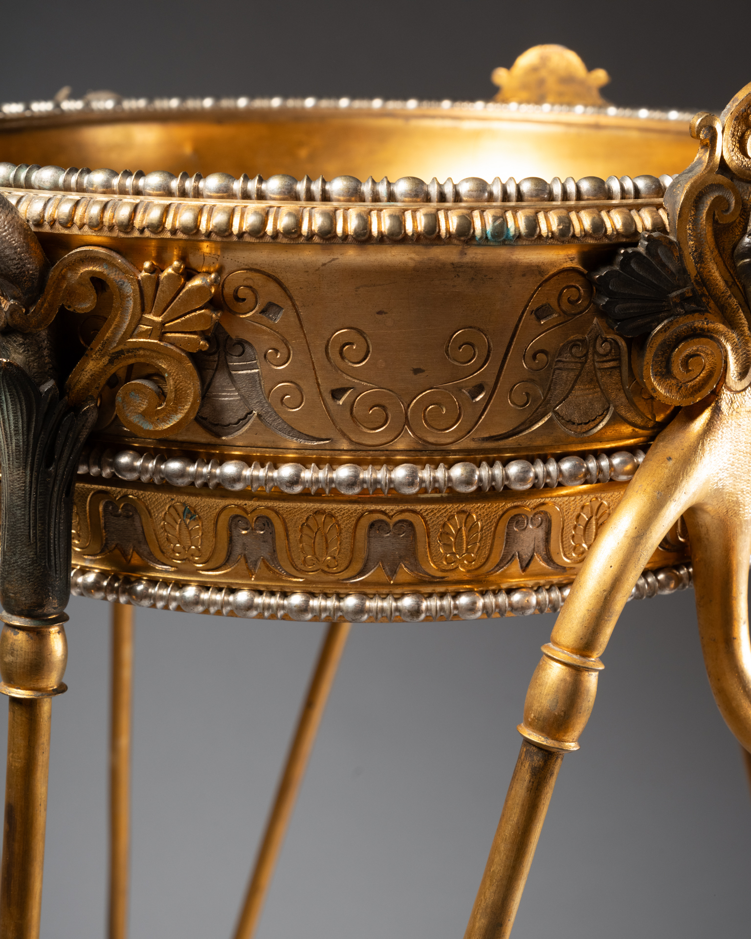 Les trois supports prennent la forme de têtes masculines barbues traitées à l’antique, bustes anthropomorphes se prolongeant en bras stylisés, et animaux fantastiques assimilables à des griffons ou dragons, formant anses et éléments de liaison. Les pieds se terminent par des pattes griffues reposant sur des socles circulaires, renforçant l’aspect archaïsant et monumental de l’ensemble.