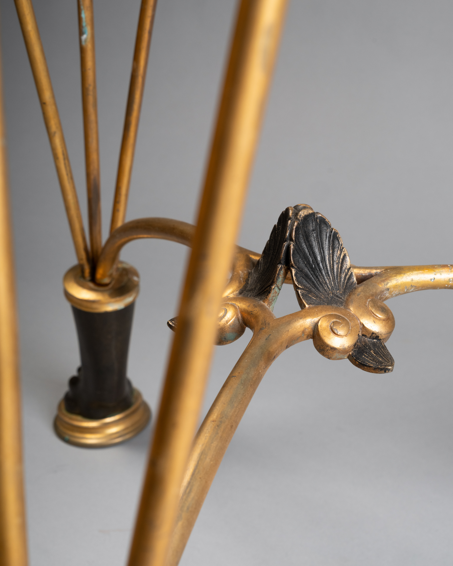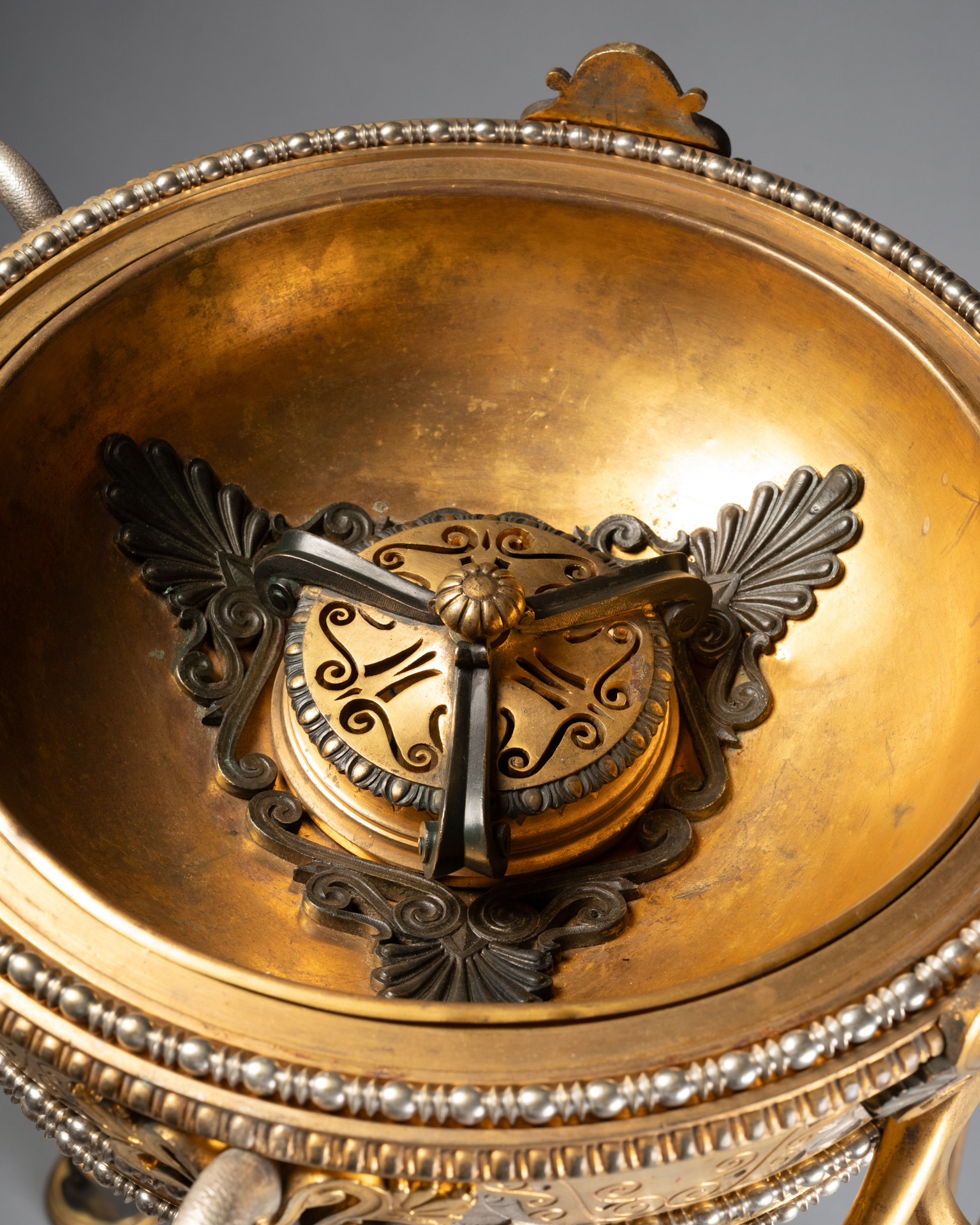 Trépied brûle-parfum en bronze finement ciselé, reposant sur trois montants élancés réunis par une entretoise circulaire. Le récipient supérieur, de forme circulaire évasée, est souligné de frises moulurées et de rinceaux d’inspiration antique.