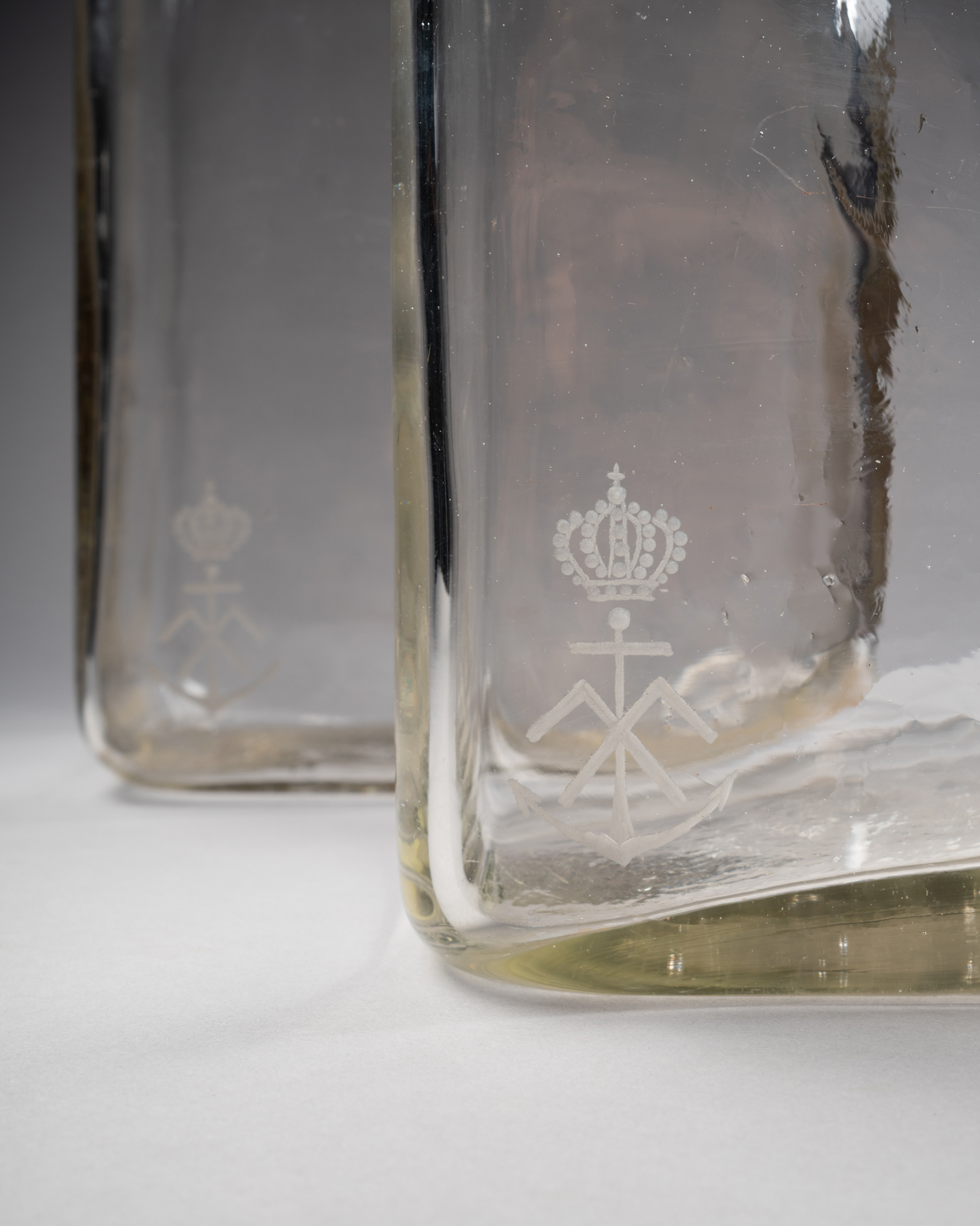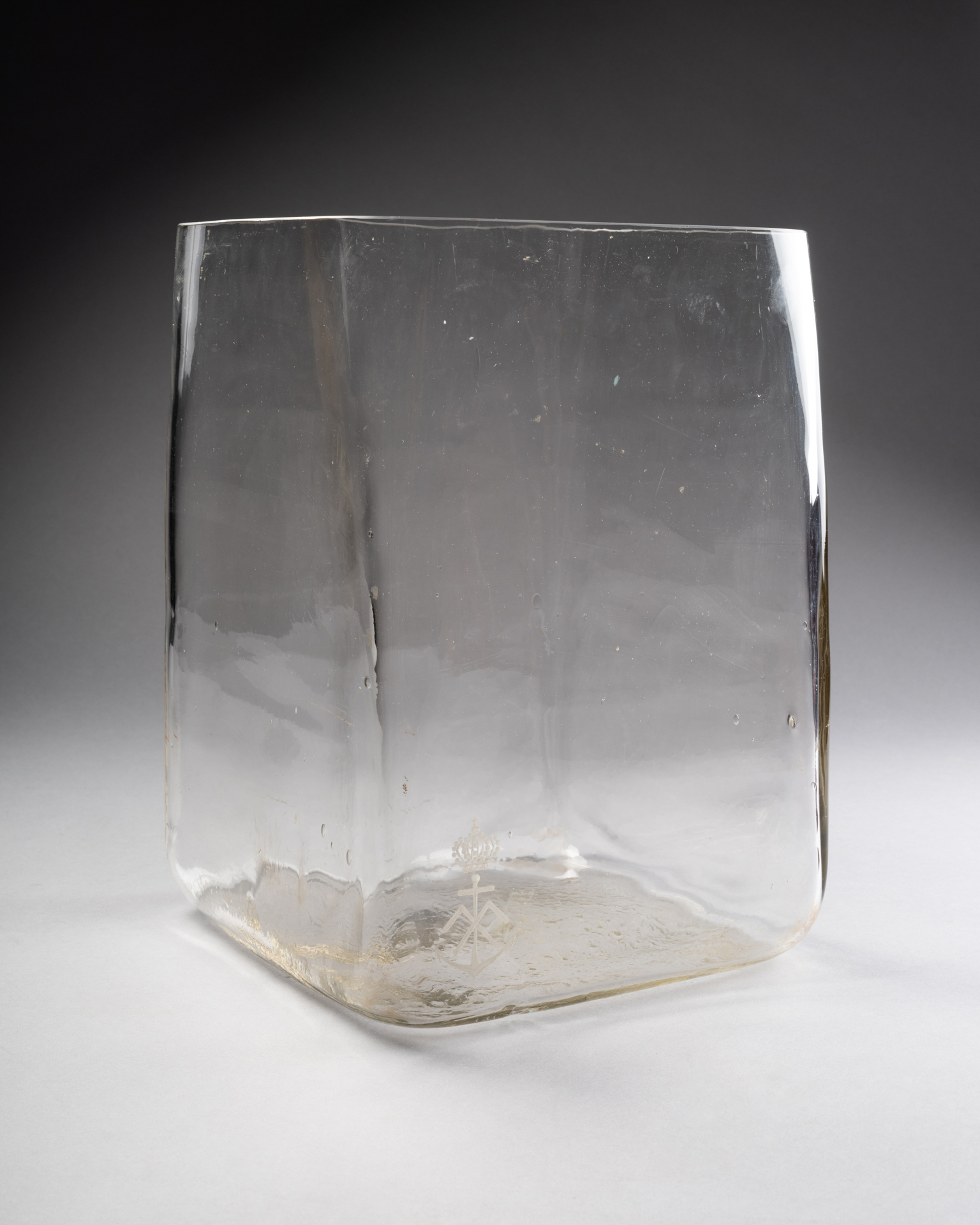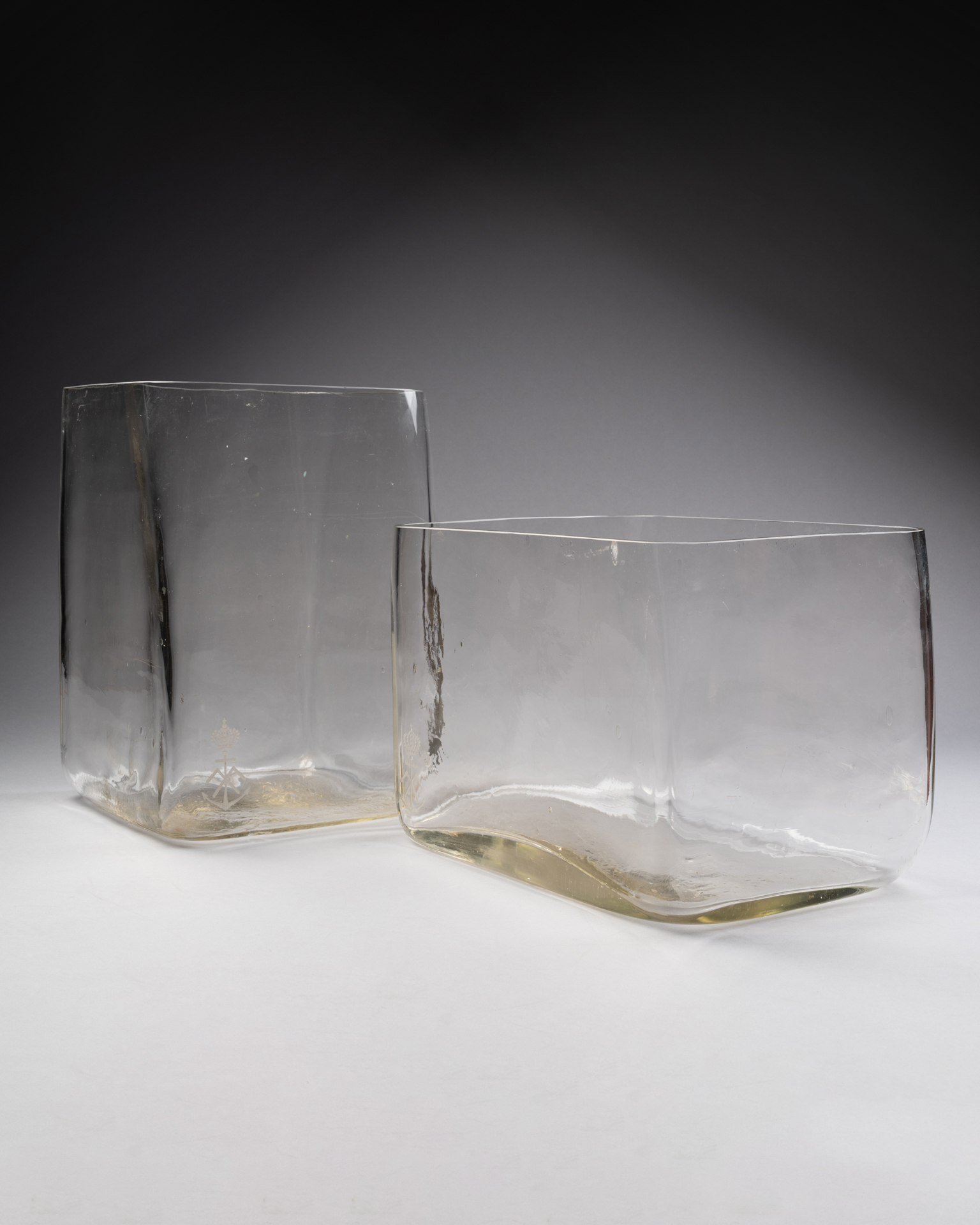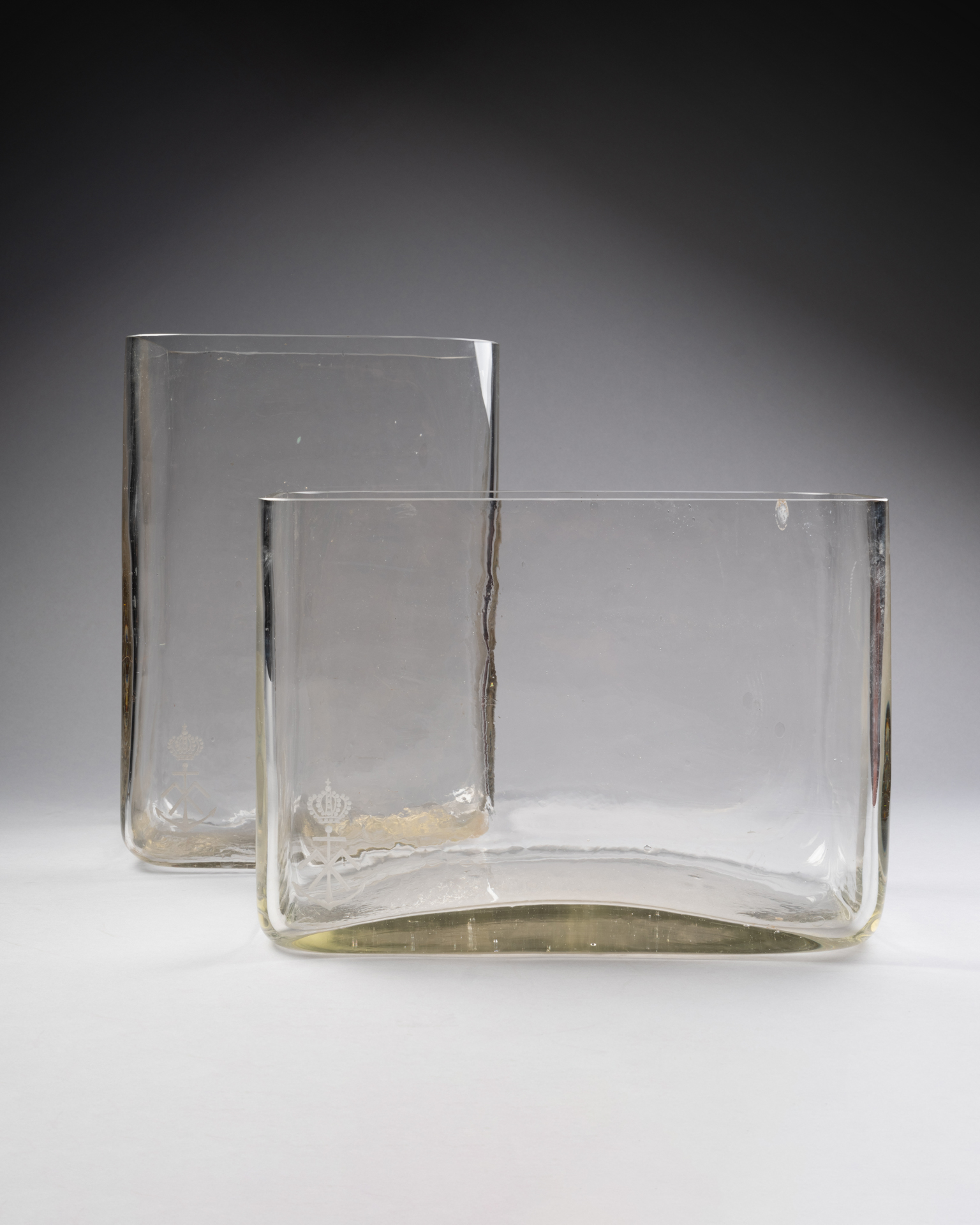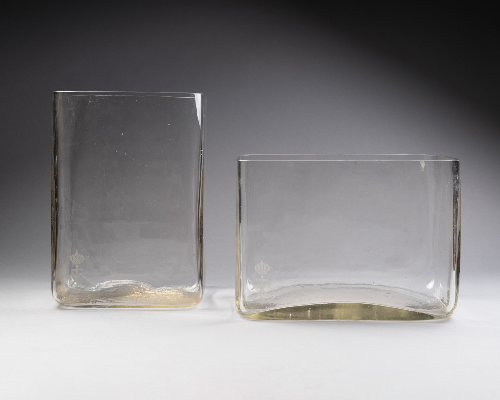 Deux grands vases en verre, l’un rectangulaire et l ‘autre carré, gravés au chiffre sous couronne fermée de l ‘Amiral Georges de Gréce.